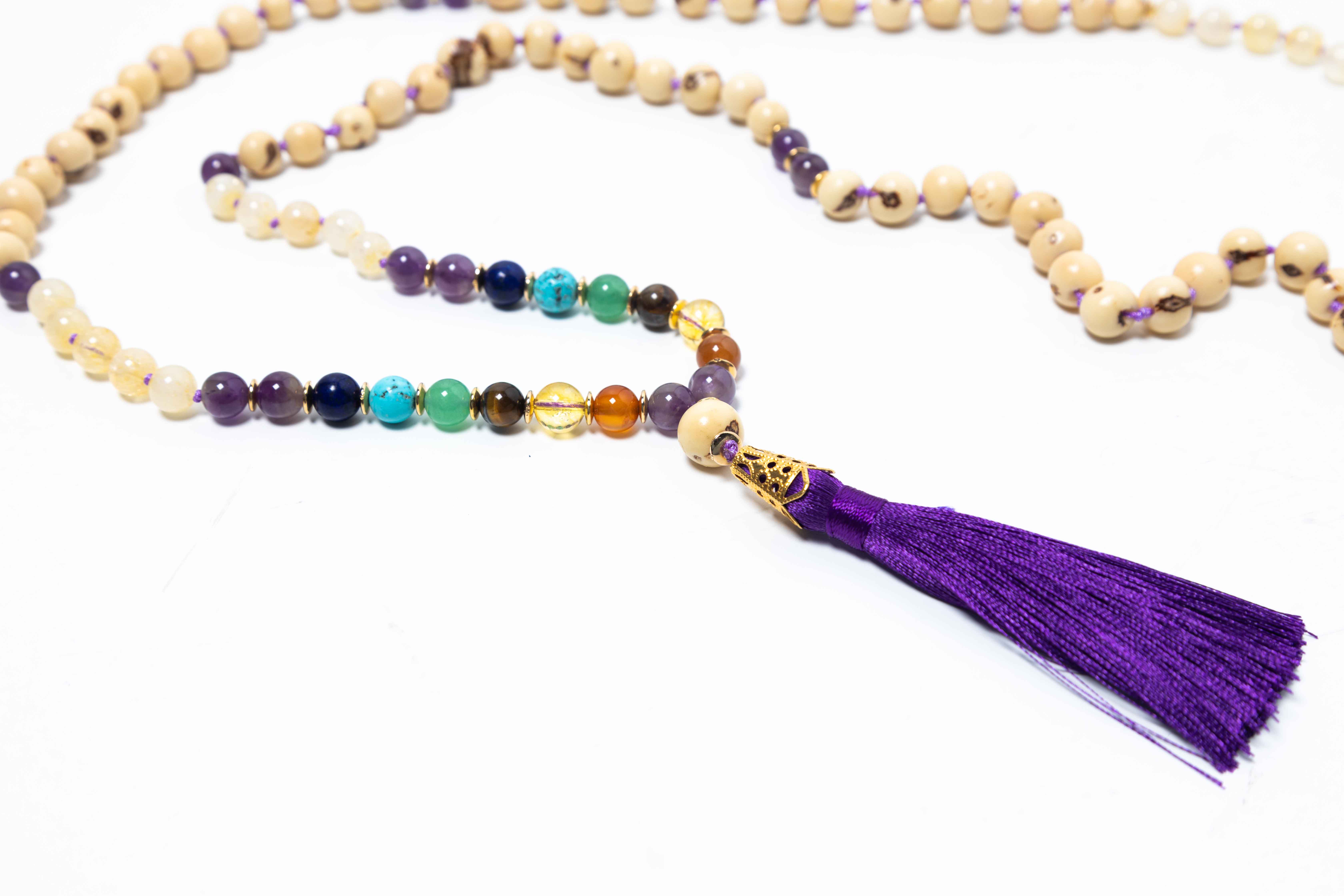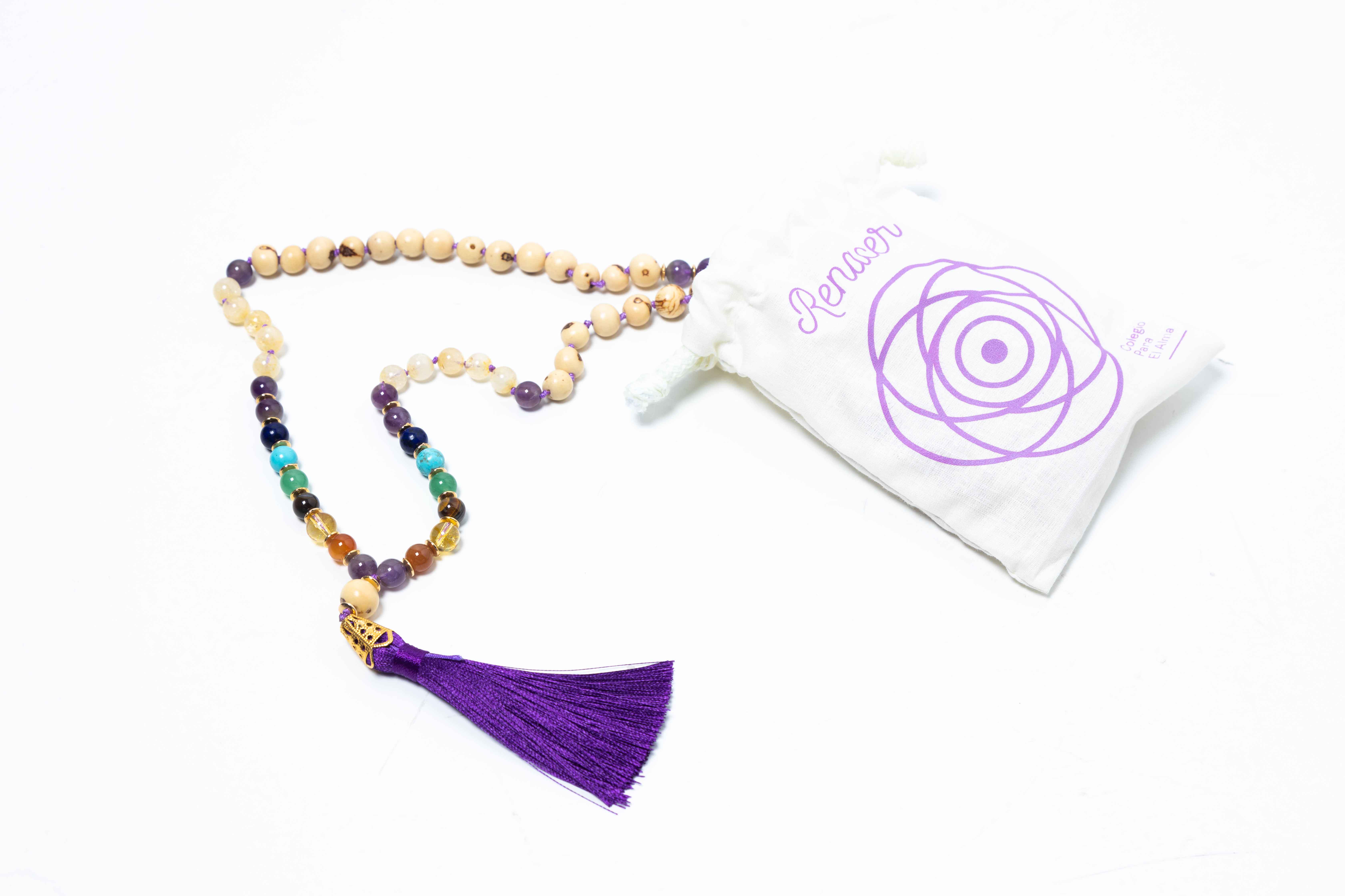 Descripción: es una herramienta espiritual que consta de un collar con 108 cuentas de piedras en colores representativos a los colores de los siete chakras principales, se utiliza para recitar oraciones, el Japa Mala se utiliza para repetir mantras, es decir, frases o palabras que producen una vibración y que, repetidos, calman la mente y pueden llevarnos a un estado de conciencia superior.