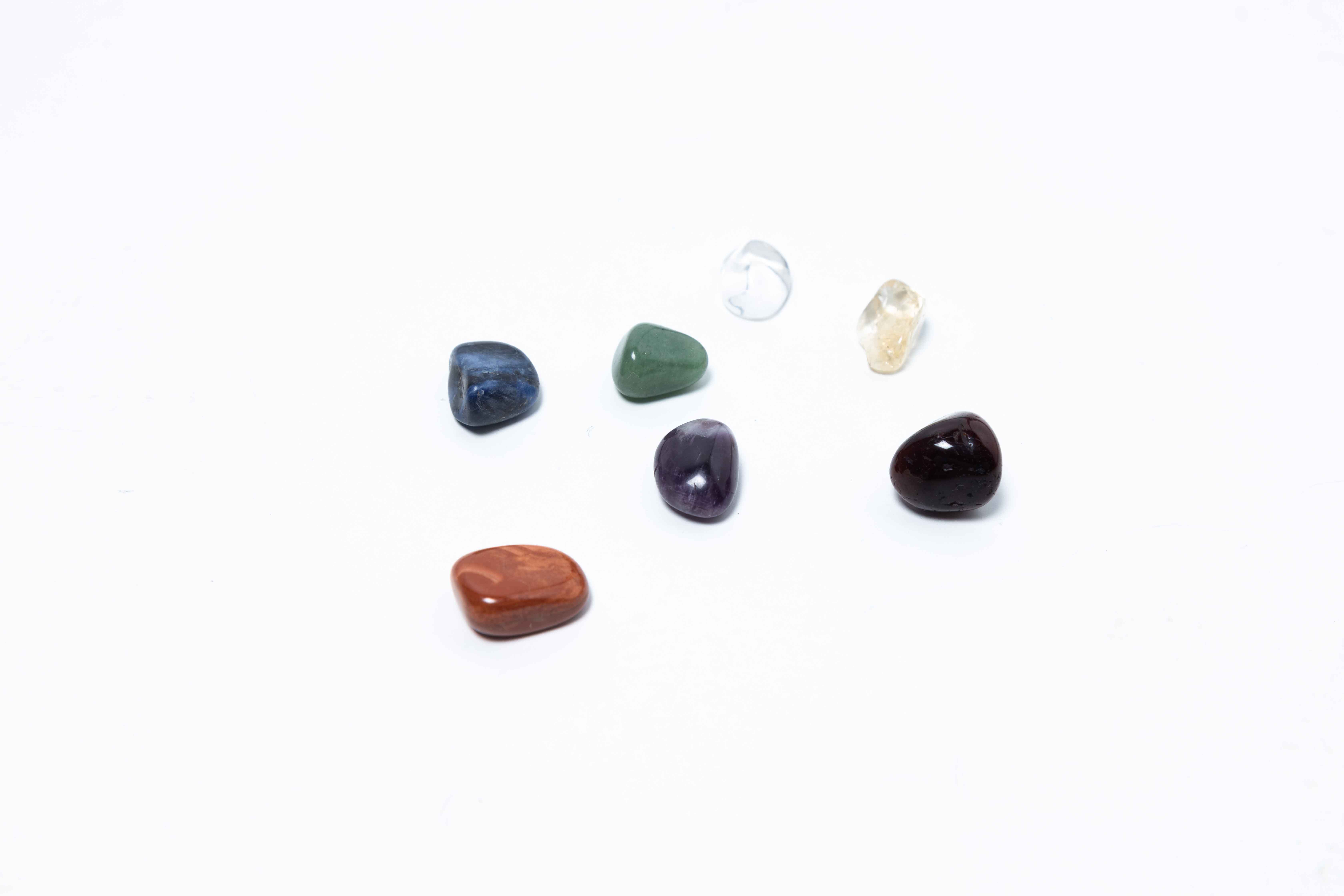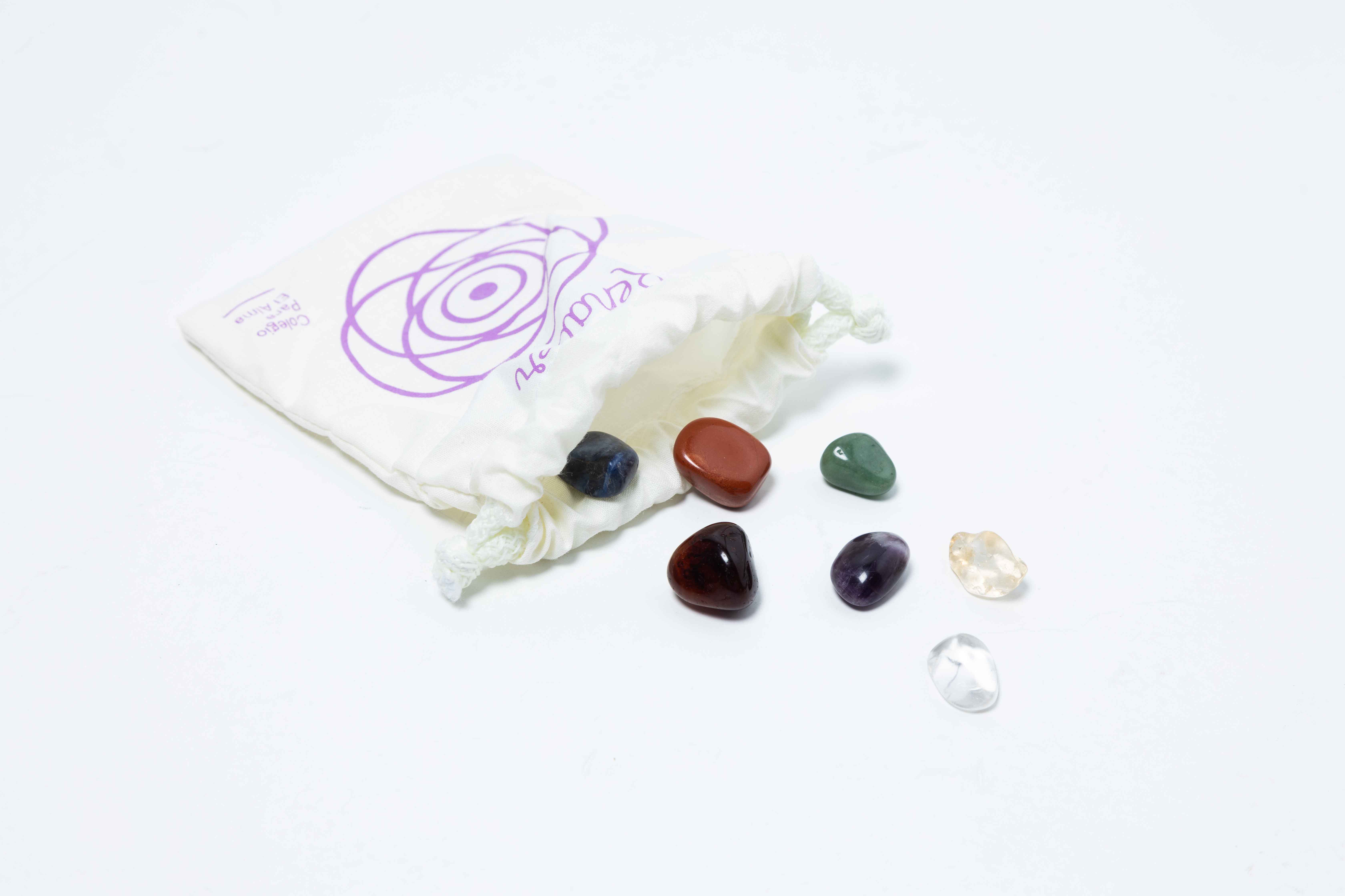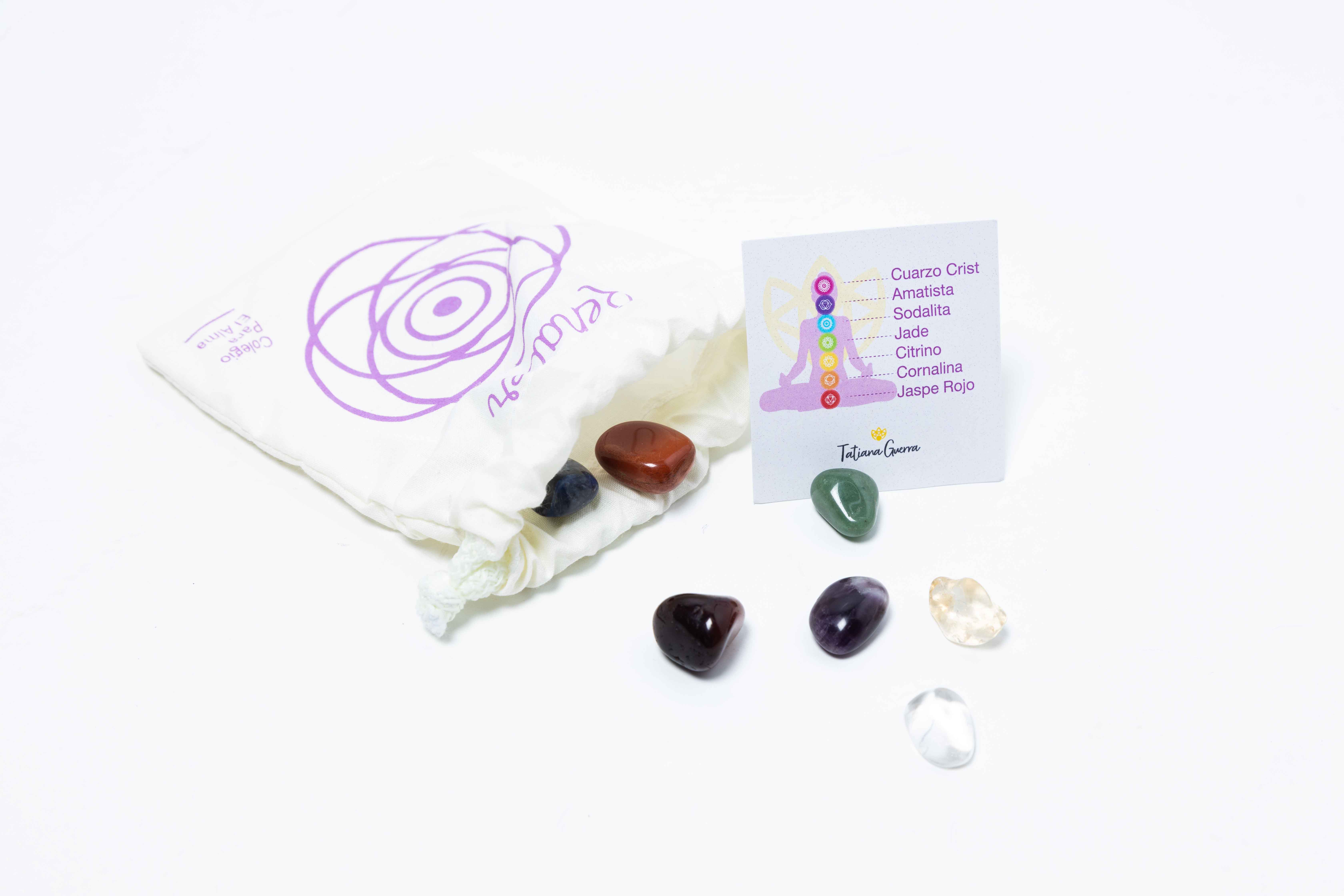 Descripción: es un kit que contiene siete piedras que representan la energía de los siete chakras, jaspe rojo, Cornalina, Citrino, Jade, Sodalita, Amatista y Cuarzo cristal.